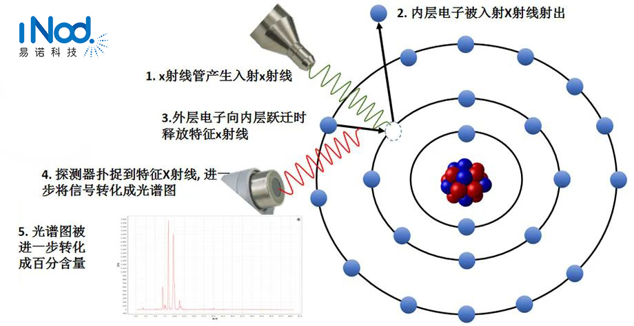 奧林巴斯手持式光譜儀的試樣中被測元素的原子受到來自于X射線管的一次X射線激發(fā)而引起內(nèi)層電子的躍遷,同時(shí)發(fā)射出具有一定能量的X 射線二次熒光,利用高性能(能量分辨率<170eV)的X 射線硅漂移SDD檢測器探測試樣中被測元素所發(fā)出的各種能量的特征X 射線,根據(jù)檢測器輸出信號(hào)的能量大小和強(qiáng)度來對(duì)被測元素進(jìn)行定性和定量分析。