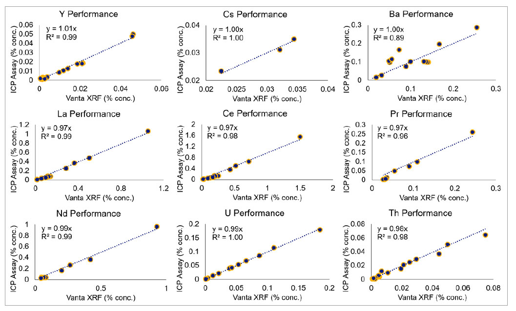 使用Vanta手持式XRF光譜儀,可以對稀土進行檢測。手持XRF光譜儀在檢測各種礦產品樣品(包括氟碳酸鹽和次生磷酸鹽)時,表現出非常高的性能。氟碳酸鹽通常是氟碳鈰礦,可提供釔、鈰和鑭;而磷酸鹽通常是獨居石,不僅含有鑭、鈰、鐠和釹,還含有較重的稀土元素釤和釓,以及放射性較弱的釷。正如每個圖表所示,元素的斜率和R2都接近于1,說明Vanta在檢測氟碳鈰礦石和獨居石時均表現出很高的準確性。