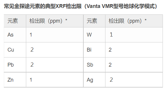 大多數(shù)金礦床都有其特定的地球化學(xué)特征(如上表所示)。XRF分析儀可以探測到這些地球化學(xué)特征,從而可使地質(zhì)學(xué)家更清楚地了解他們正在勘查的地質(zhì)系統(tǒng)。典型的金探途元素包含As、Cu、Pb、Zn、Sb、Bi、Ag和W。