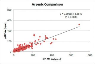 來自加拿大的金元素勘探項目,XRF分析儀在野外繪制的表面土壤中As、Cu和Pb元素等值線圖對比ICP分析。