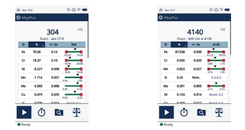 由于屏顯牌號對比信息的存在,用戶可以將合金牌號手冊留在辦公室中。得益于屏顯牌號對比信息功能,用戶可以對比Vanta分析儀屏幕上排列在一起的近似牌號,以了解最佳匹配牌號以及如此判斷的原因。