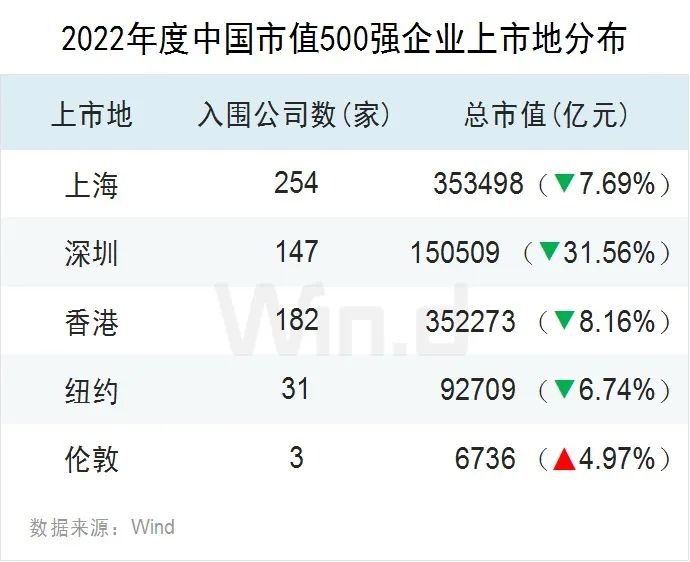 2022年度,因股市整體回調,上市公司股價集體走弱,入圍公司總市值亦出現明顯下降,其中,上海入圍公司總市值3.53萬億元,下降7.69%;深圳入圍公司總市值1.51萬億元,下降31.56%;香港入圍公司總市值3.52萬億元,下降8.16%;紐約入圍公司總市值9.27萬億元,下降6.74%。