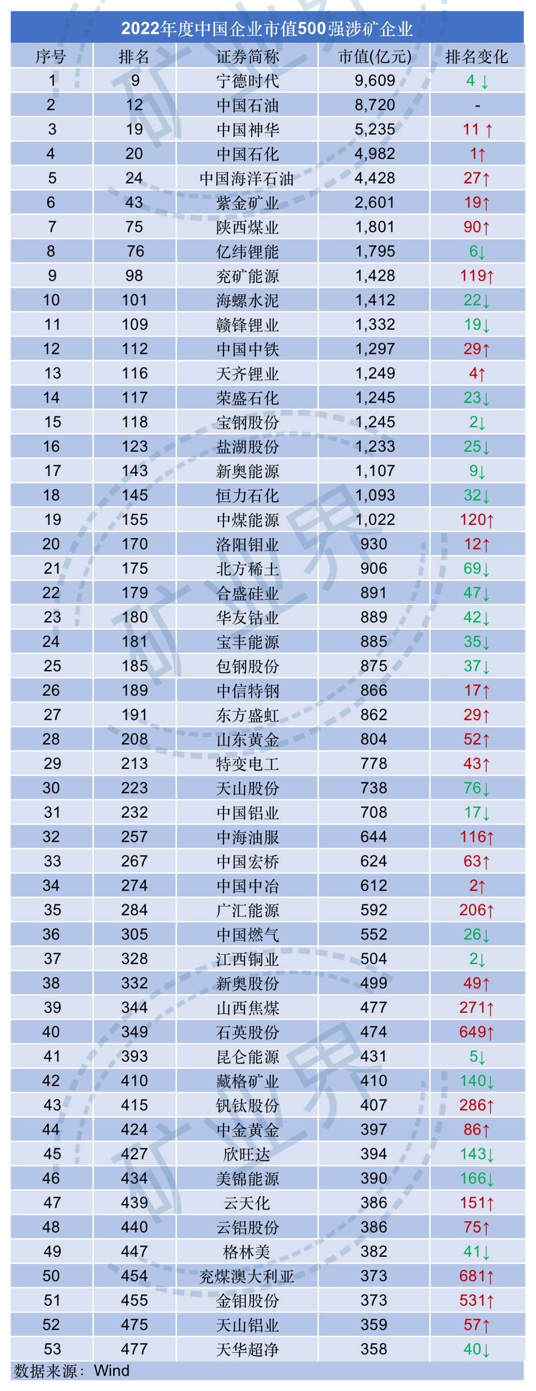 這53家礦業企業竟然入圍到2022年中國上市企業前500強