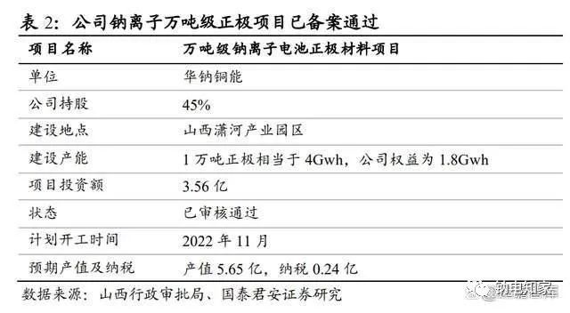 2)華鈉銅能:主要承擔鈉離子電池正極材料的研發和生產,公司持有股權45%;