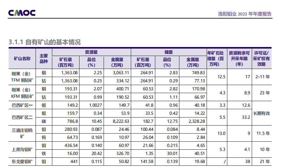 根據洛陽鉬業(yè)2023年年報,公司擁有多個優(yōu)質礦山資源。其中,國內三座,分別是上房溝鉬礦、三道莊鉬礦和東戈壁鉬礦。此外,公司在海外還有四座礦山。除了剛果(金)的TFM和KFM兩座礦山外,還有巴西的鈮礦和磷礦。其中,TFM是全球最大的銅鈷礦之一,KFM是全球第一大鈷礦,巴西鈮礦是世界第二大鈮礦。