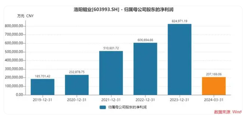 據(jù)洛陽鉬業(yè)披露的2024年上半年業(yè)績預告顯示,預計上半年實現(xiàn)凈利潤潤為51.89億元到57.35億元,同比增加638%至716%,其中今年二季度凈利潤高達31.17億元至36.63億元,為上市以來單季利潤次高。據(jù)測算,洛陽鉬業(yè)2024年凈利潤將達到110-120億元。