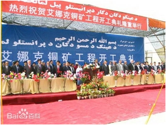 根據(jù)最終簽署的協(xié)議,艾娜克銅礦項(xiàng)目生產(chǎn)規(guī)模為年產(chǎn)精煉銅22萬(wàn)噸(計(jì)劃擴(kuò)大到年產(chǎn)30萬(wàn)噸),項(xiàng)目建設(shè)期5年,開(kāi)采期限30年。配套設(shè)施包括一個(gè)40萬(wàn)千瓦的火電廠、一個(gè)水源地泵站和一個(gè)磷肥廠,以及學(xué)校、醫(yī)院、清真寺等公共服務(wù)設(shè)施,還計(jì)劃修建鋼廠和鐵路等。總投資將超過(guò)100億美元。