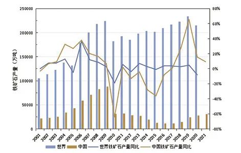 二是我國國內鐵礦石產量占比逐年下降。2010年以來,我國鐵礦石產量急劇減少并持續下行,至2017年才開始逐漸回升。2010年至2021年期間,我國自產鐵礦石同比除個別年份外,均為負值。整體來看,2010年后國內鐵礦石供給占比已不占據主導,占比從2001年的61.7%降低至2021年的16.0%。