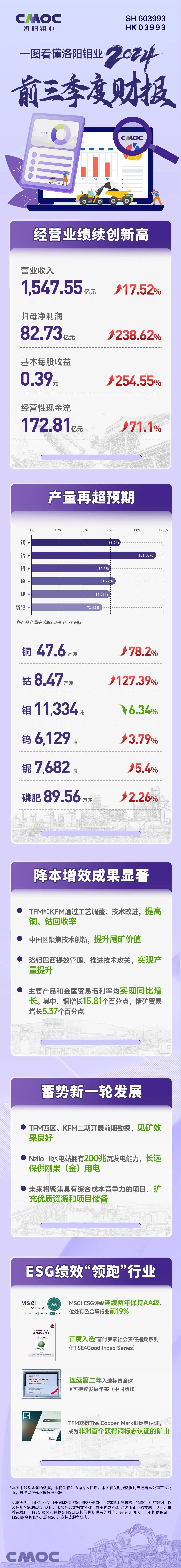 10月28日,洛陽(yáng)鉬業(yè)公布的最新財(cái)報(bào)顯示:今年前三季度,公司實(shí)現(xiàn)營(yíng)業(yè)收入1547.55億元,同比增長(zhǎng)17.52%;歸屬于上市公司股東的凈利潤(rùn)超越2023年全年業(yè)績(jī),達(dá)到82.73億元,同比增長(zhǎng)238.62%;基本每股收益0.39元,同比增長(zhǎng)254.55%。