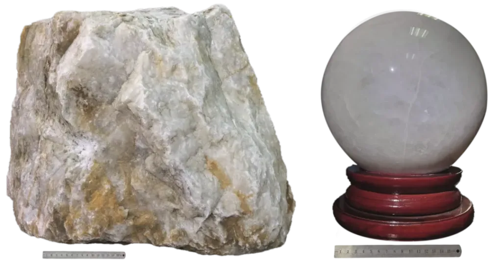 我國脈石英高純石英優質原料或A級礦(左)和安哥拉脈石英加工的石英球(右)。成都自然博物館(成都理工大學博物館)/ 藏