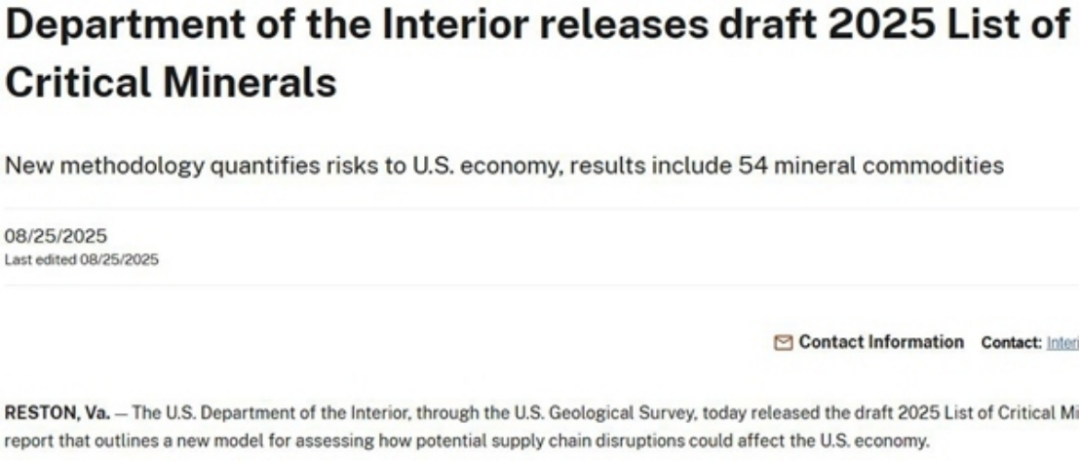 當(dāng)?shù)貢r(shí)間8月25日,美國(guó)地質(zhì)調(diào)查局發(fā)布《2025年關(guān)鍵礦產(chǎn)清單》草案,54種礦產(chǎn)被列入清單。根據(jù)美國(guó)《能源法案》,關(guān)鍵礦產(chǎn)是由美國(guó)地質(zhì)勘探局認(rèn)定的對(duì)美國(guó)經(jīng)濟(jì)和國(guó)家安全至關(guān)重要的礦產(chǎn)或物質(zhì),且相關(guān)礦產(chǎn)是產(chǎn)品制造的基礎(chǔ),但供應(yīng)鏈脆弱。被確定為關(guān)鍵礦產(chǎn)后,相關(guān)礦產(chǎn)的勘探開采和處理將享受資金激勵(lì)和更廣泛的支持性政策。