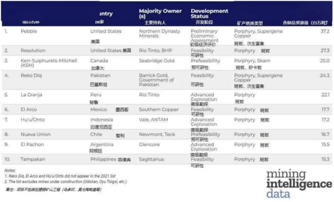 外媒Mining Intelligence根據(jù)三級(jí)(探明、推定和推測(cè))資源量更新了世界十大未開發(fā)銅礦項(xiàng)目。前兩的未開發(fā)銅礦均位于美國(guó)。
