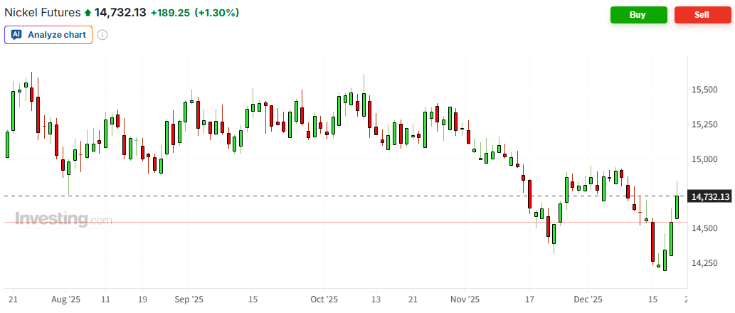 周五(12月19日)歐洲時段,倫敦金屬交易所(LME)期鎳價格漲約1.3%,報每噸14732美元。周三時,鎳價一度跌破14200美元,創今年4月以來的最低水平。